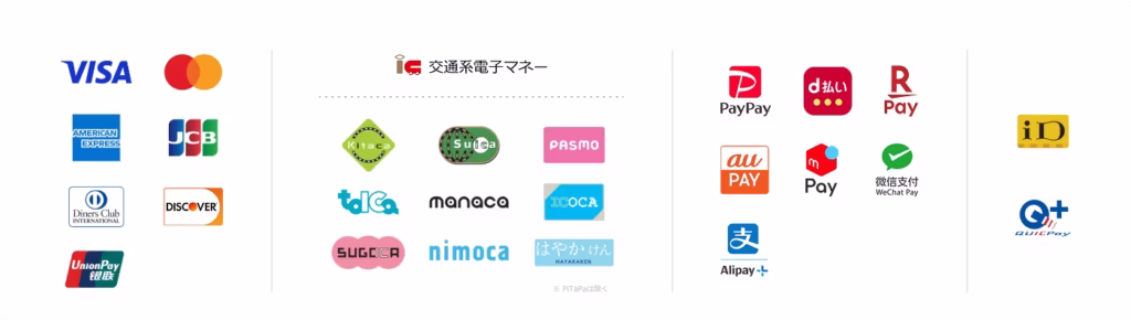 - QRコード決済(スマホ支払い):PayPay、d払い、楽天ペイ、au PAY、メルペイ、WeChat Pay、Alipay+
